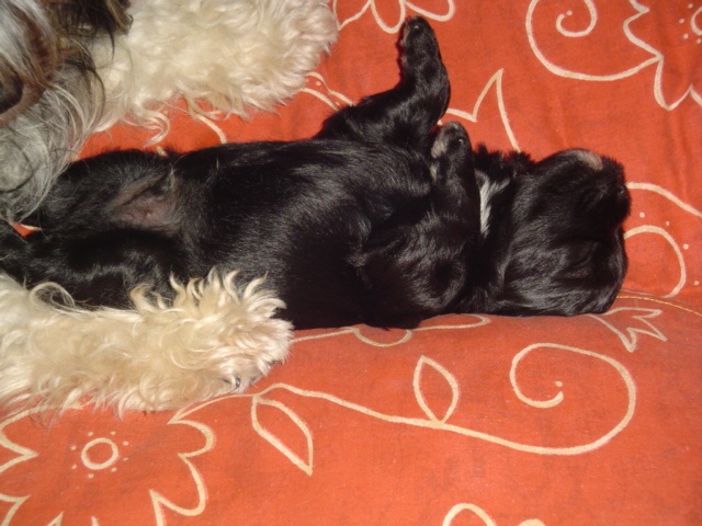 Je suis le dernier né. Je me trouve sur la droite (dernière photo). Je suis très joueur et aime beaucoup taquiner mes soeurs mais dès que l'on me prends dans les bras je suis aux anges. Le super "petit chien" au coeur tendre. Je ressemble beaucoup à ma maman au niveau caractère; jamais rancunier et toujours très "bisounours".
